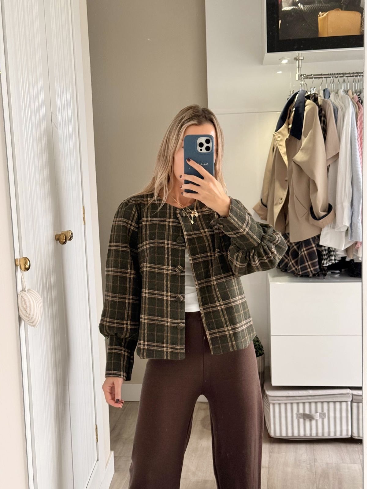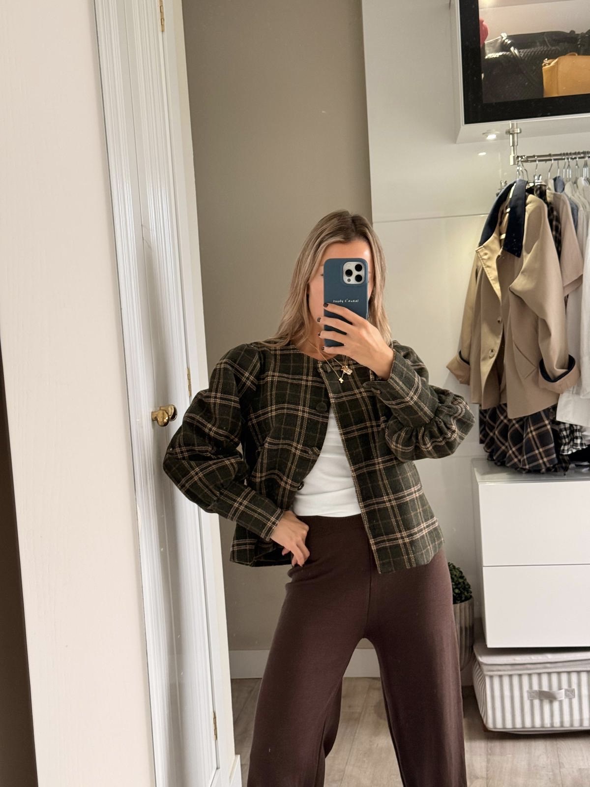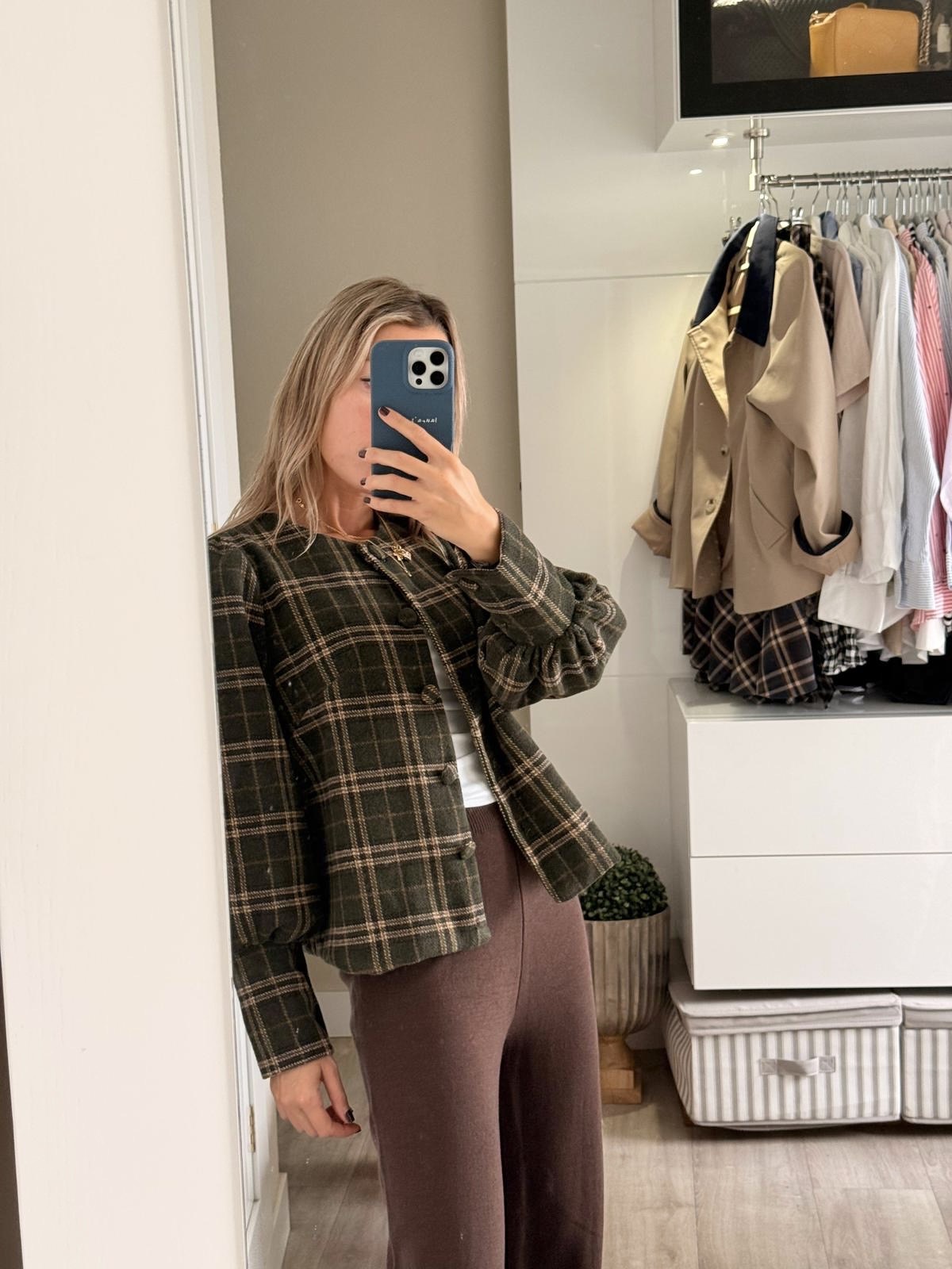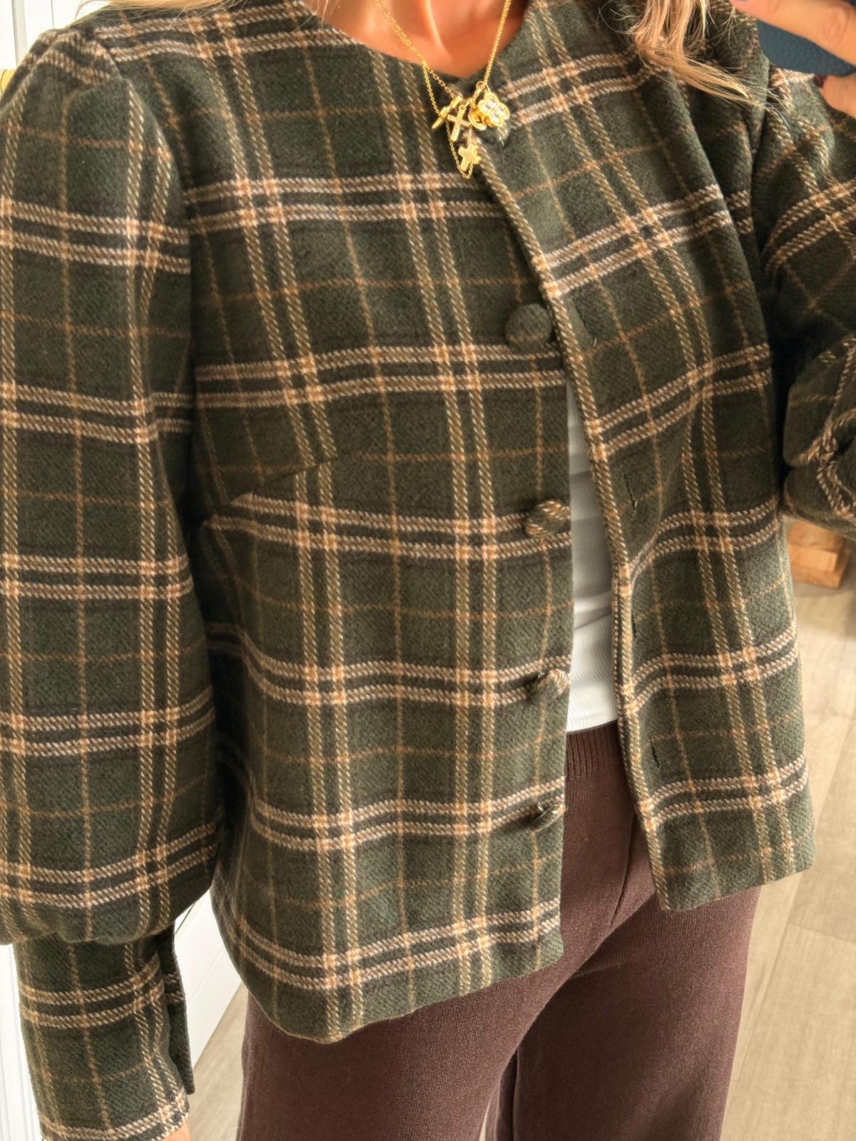 Chaqueta de cuadros con botones al medio y detalle en mangas