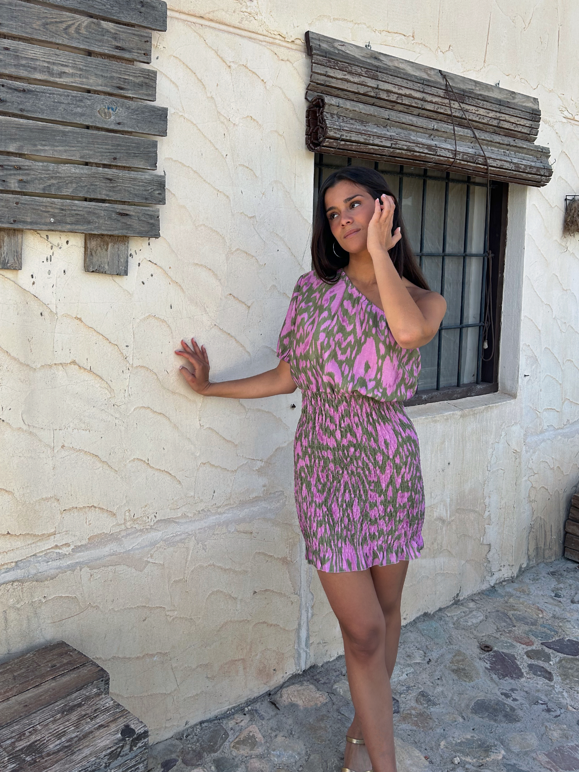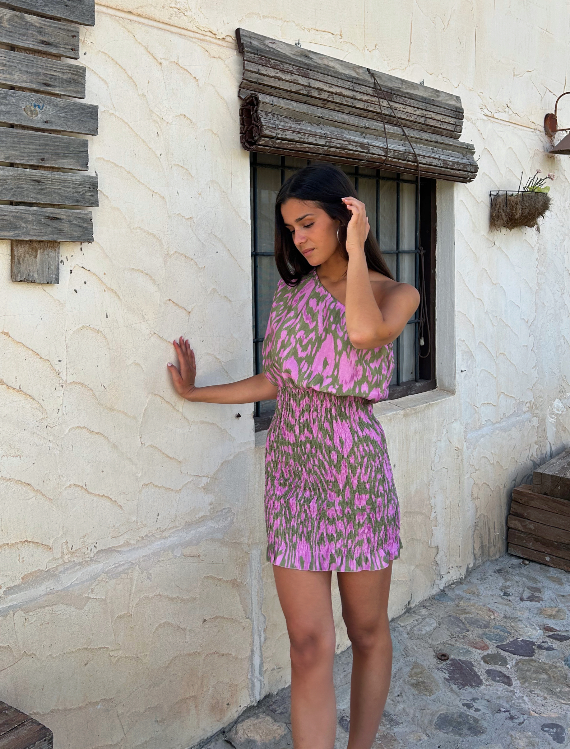 Vestido con escote asimétrico, tirante y parte inferior recta